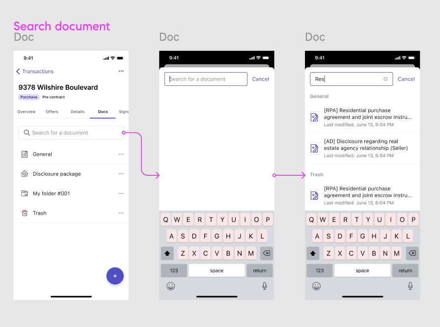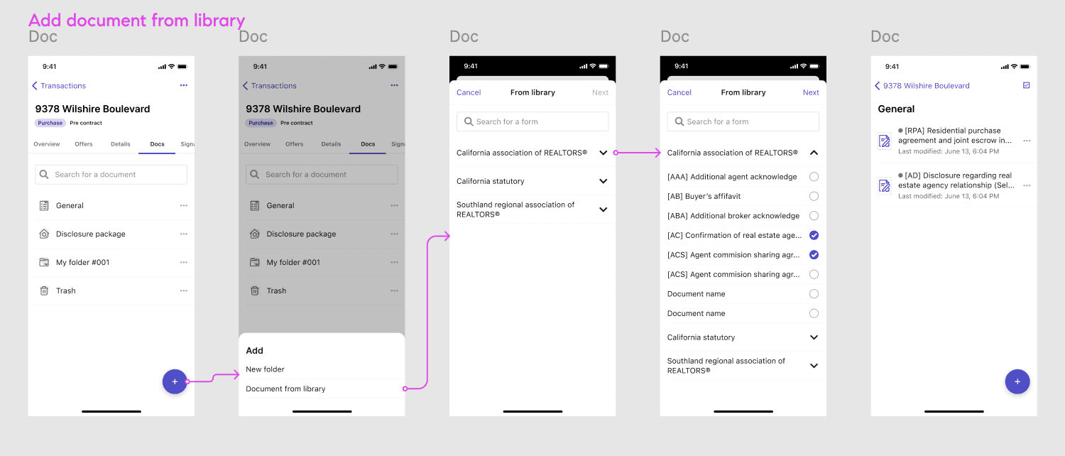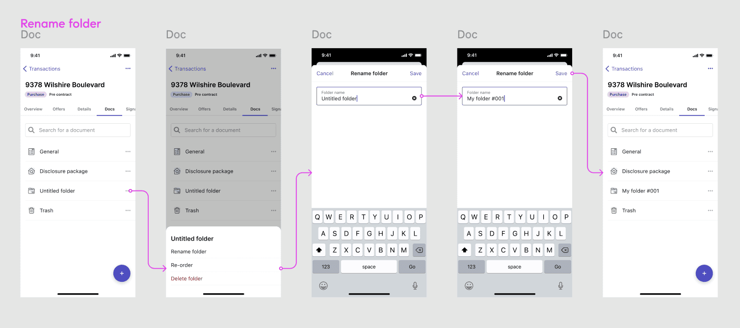 As part of the design process, I incorporated user testing. I led sessions with agents to walk through common flows like adding, renaming, and searching documents using prototypes I created. The images highlight the flows we tested, and based on feedback I refined details before rollout.